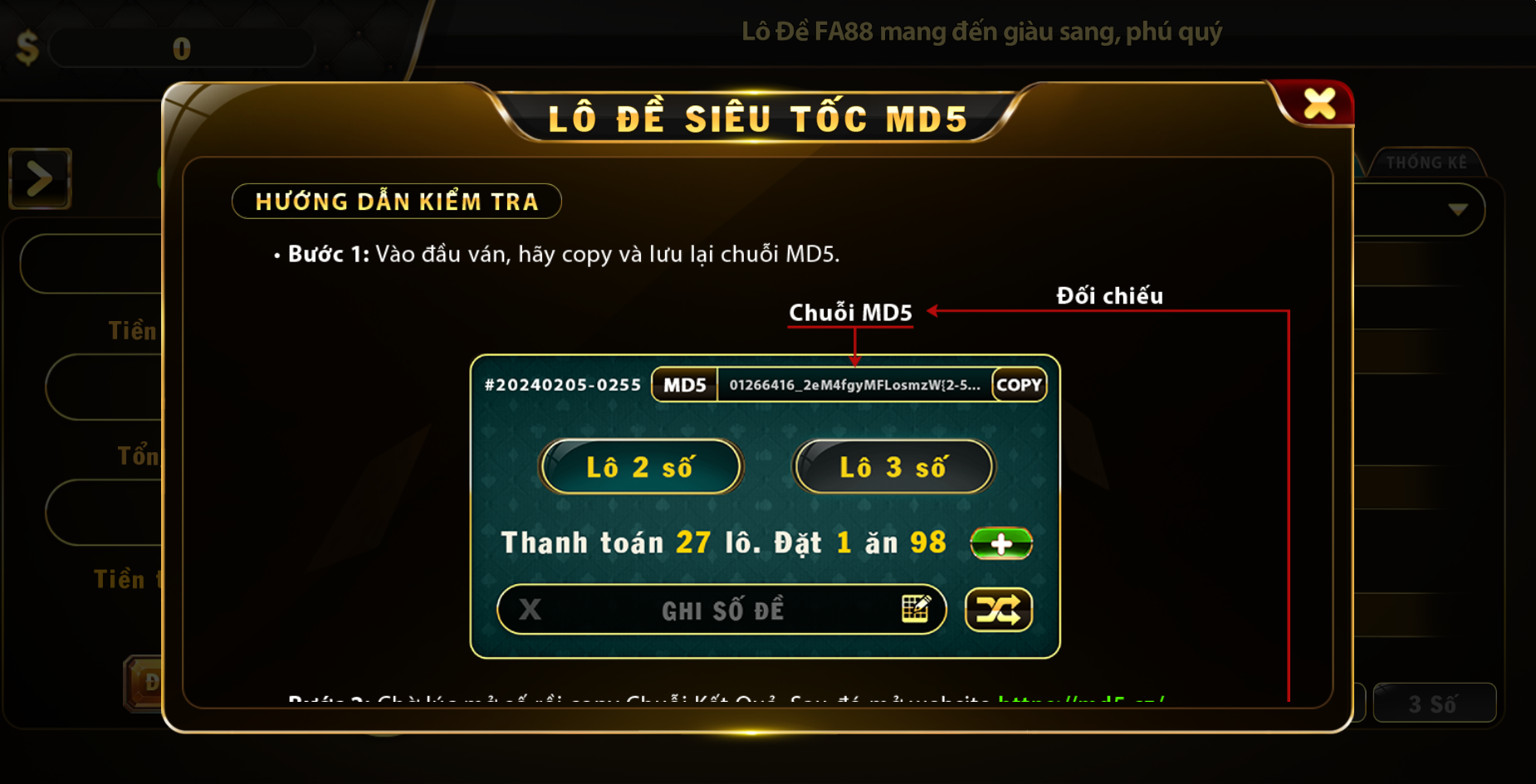 MD5 là phương pháp dùng ứng dụng của bên thứ 3 để người chơi tự đối chiếu kết quả. Dựa vào chuỗi MD5 đầu ván và chuỗi kết quả cuối ván để đảm bảo tính minh bạch và không bị thay đổi.